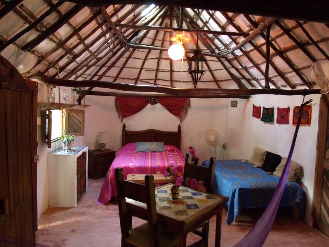 Experience the charm of an authentic rustic Mayan hut in Puerto Morelos, Mexico. This spacious ground floor bungalow offers a unique vacation getaway. With a full-size (double) bed and an additional twin-size (single) bed, it comfortably accommodates up to 3 guests (extra person rate: $12.00 US per night). Step inside and be greeted by a delightful blend of rustic Mayan architecture and modern comforts.